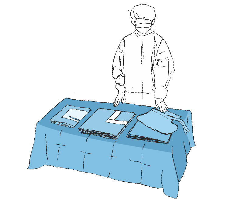 Вскрываем внешнюю упаковку соблюдая принципы асептики и размещаем комплект на столе для инструментов. Раскладываем внешнюю простыню на столе для инструментов, а на ней – отдельные элементы комплекта.