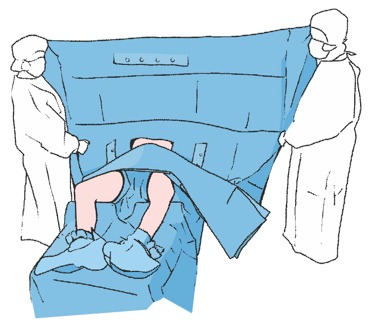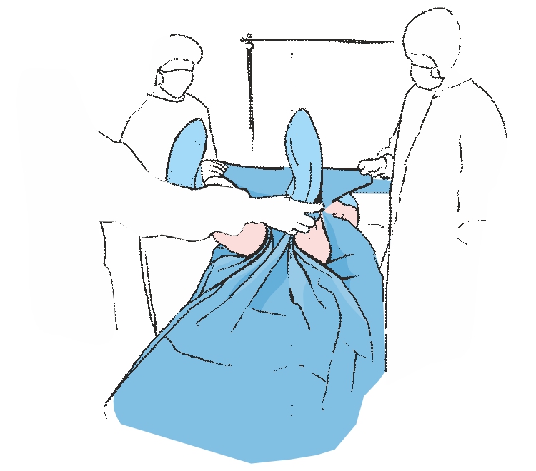 Разворачиваем нижнюю часть простыни в направлении нижнего конца операционного стола, обозначая границы операционного поля при помощи двух продолговатых отверстий.