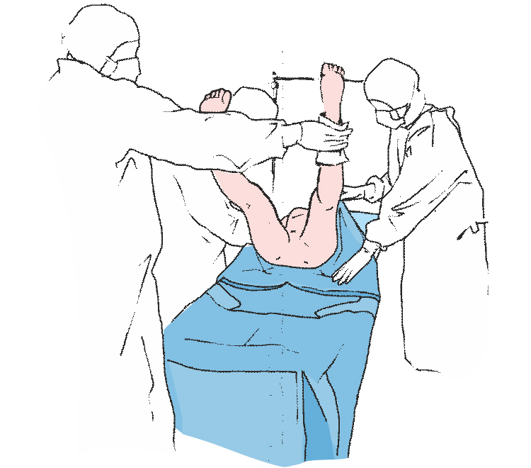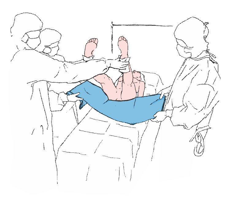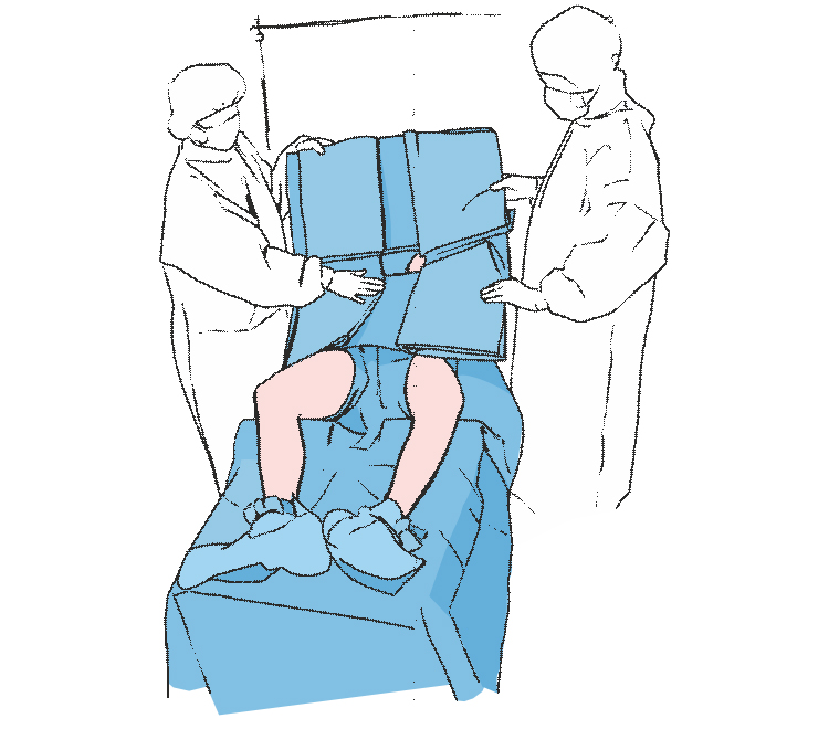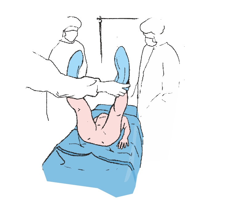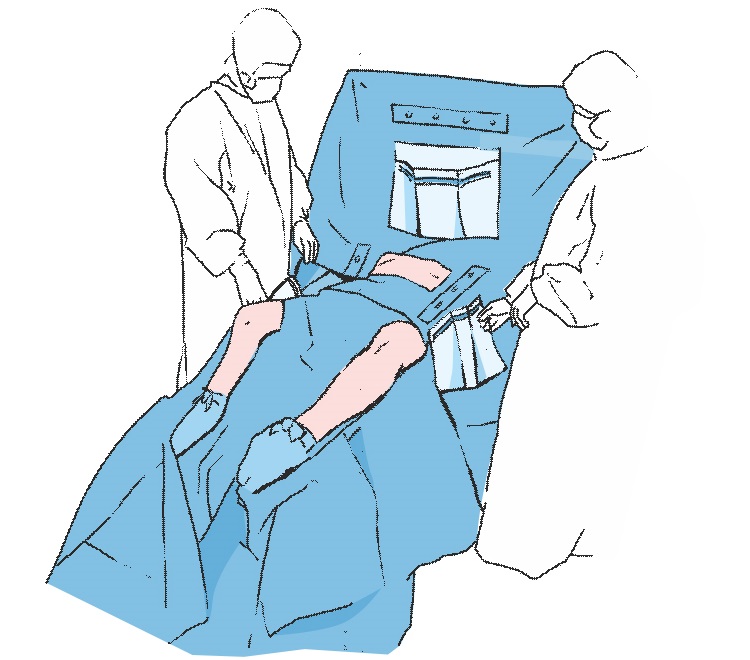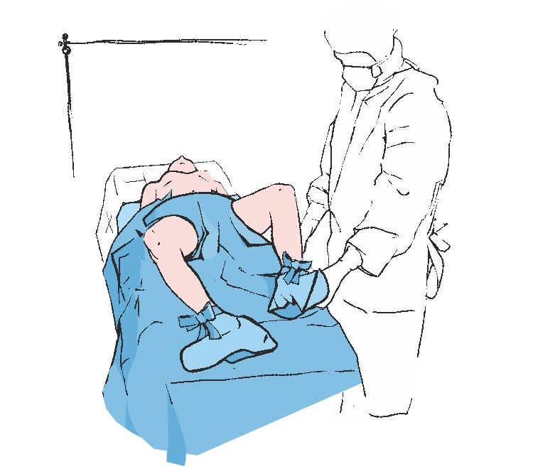 Подносим вверх ноги пациента, используя для этого салфетки, находящиеся в комплекте. Под поднятые ноги следует подложить простыню с прикрывающим клапаном на промежности.