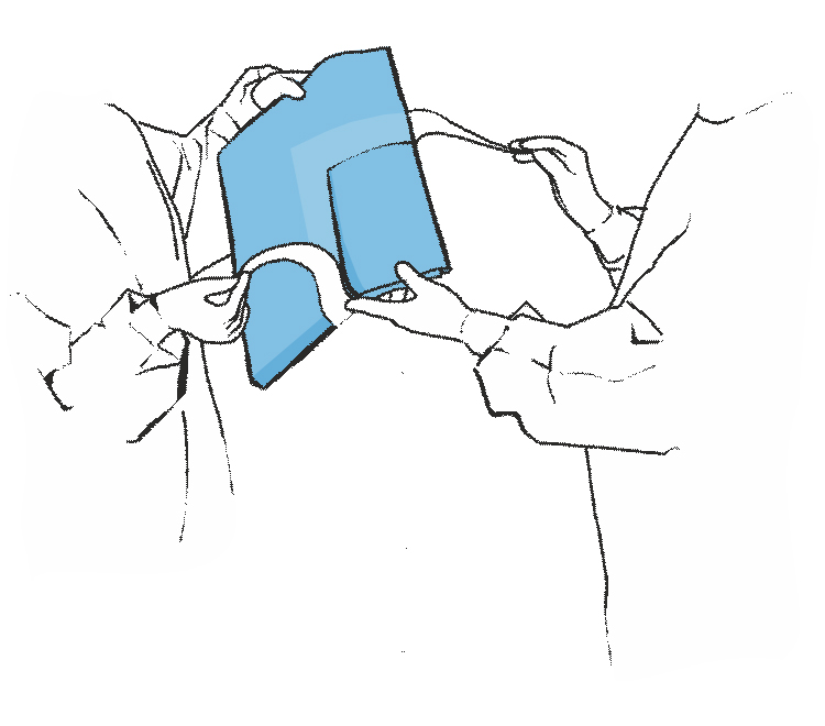 Приклеиваем к грудной клетке, обозначая таким образом операционное поле. Следует нажать в области адгезивного края, чтобы крепко приклеить простыню к коже пациента.