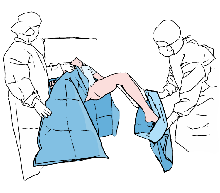 Перекидываем простыню через рамку, создавая таким образом анестезиологический экран. Разворачиваем нижнюю часть простыни в направлении нижнего конца операционного стола, частично между ногами пациентки.