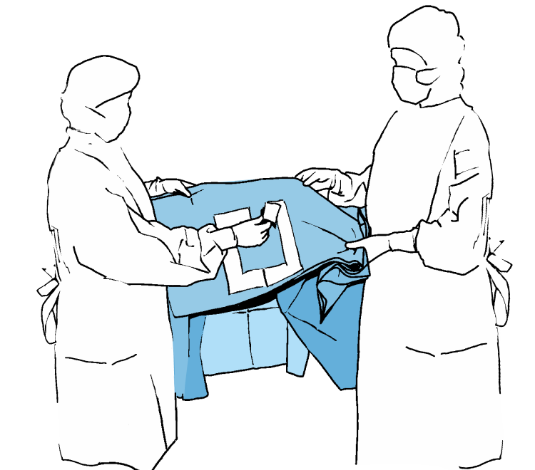 Приклеиваем простыню таким образом, чтобы не было складок, обозначая одновременно верхнюю и боковые границы операционного поля. Следует нажать в области адгезивного края, чтобы крепко приклеить простыню к коже пациентки.