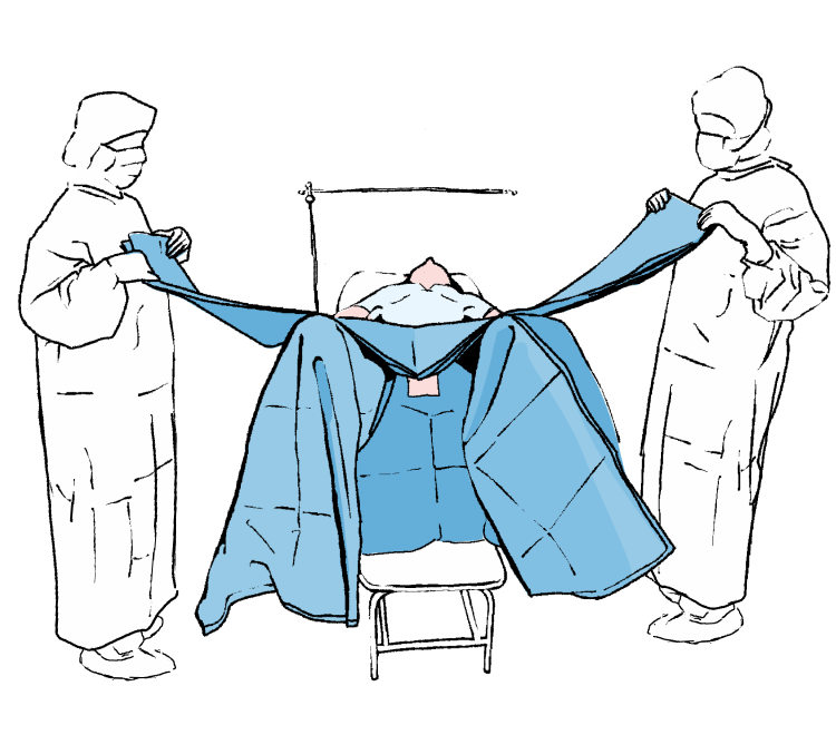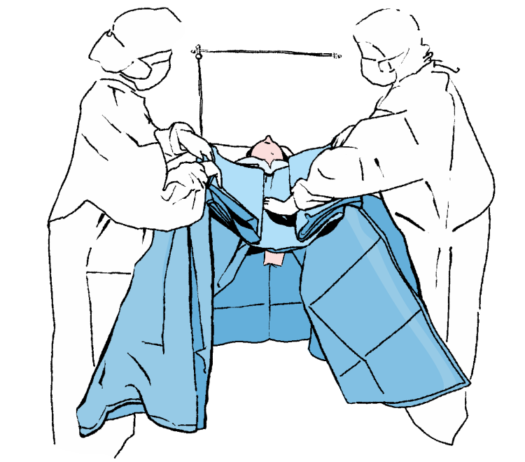 Разворачиваем бока простыни таким образом, чтобы они свободно свисали с операционного стола, а затем разворачиваем верхнюю часть простыни в направлении головы пациента (в направлении анестезиологического экрана).