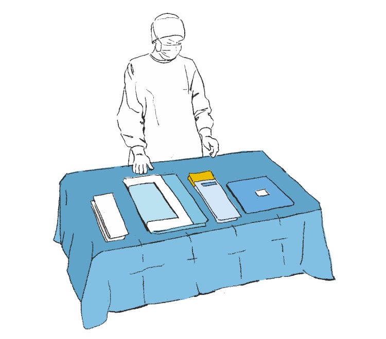 После вскрытия упаковки раскладываем комплект на инструментальном столе. Простыня на инструментальный стол, в которую завернут комплект выполняет функцию защиты инструментального стола, на ней следует разложить элементы комплекта.