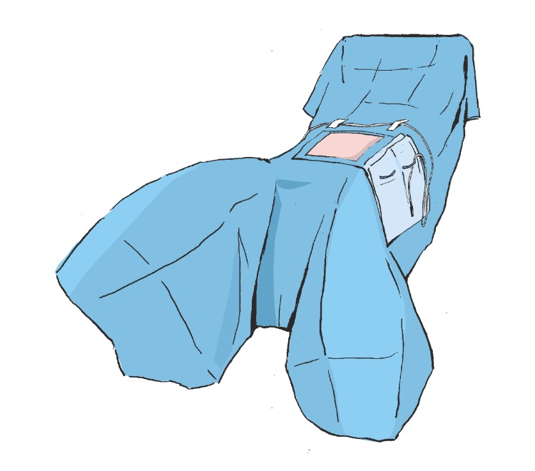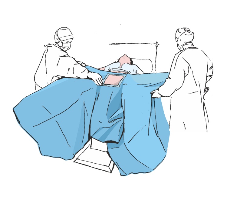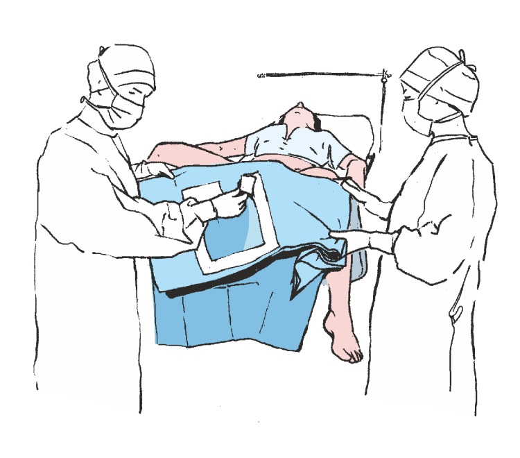 Одеваем интегрированные чехлы на ноги пациента и приклеиваем простыню к животу пациента, обозначая таким образом операционное поле. Следует нажать в области адгезивного края, чтобы крепко приклеить простыню к коже пациента.