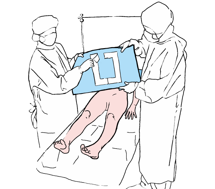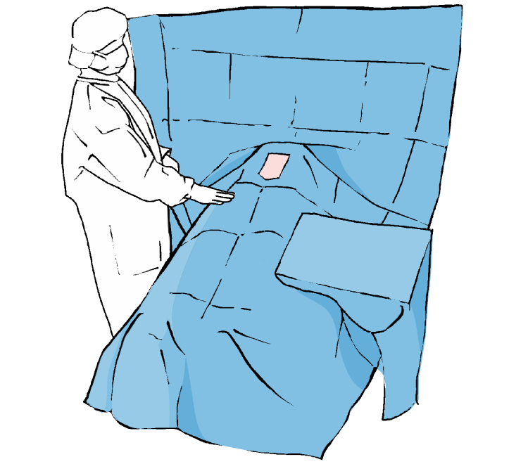 Удаляем защитную бумагу с главной простыни. Приклеиваем простыню таким образом, чтобы не было складок, обозначая одновременно верхнюю и боковые границы операционного поля. Следует нажать в области адгезивного края, чтобы крепко приклеить простыню к коже пациента.