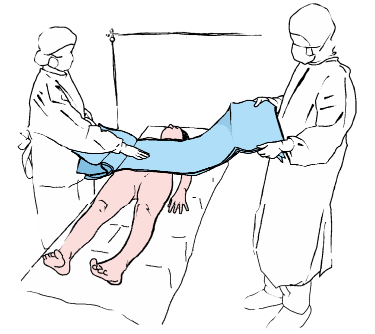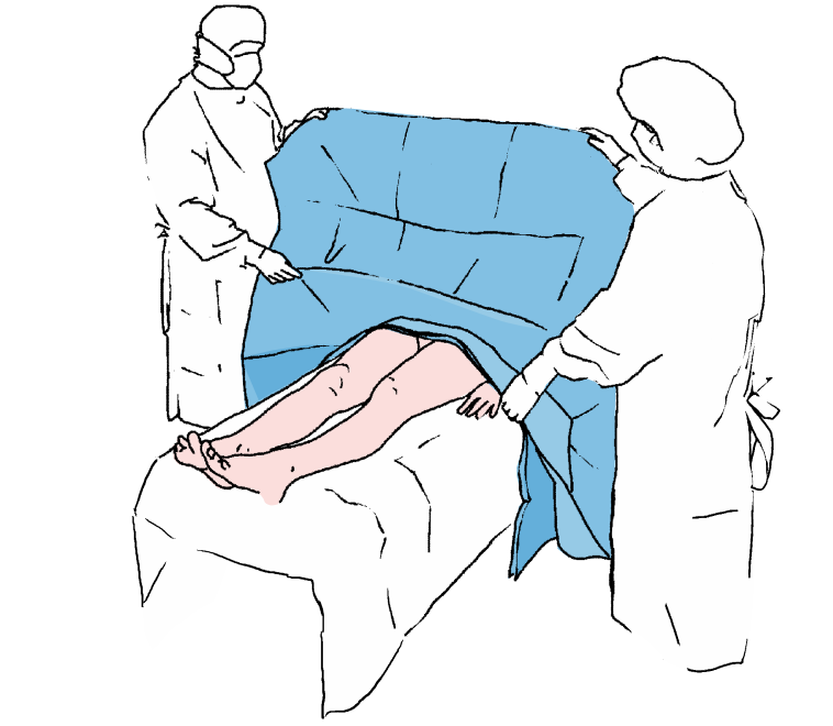Разворачиваем нижнюю часть простыни в направлении нижнего конца операционного стола, закрывая таким образом нижние конечности пациента.