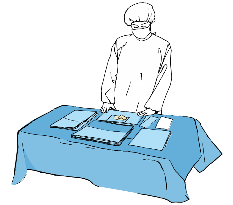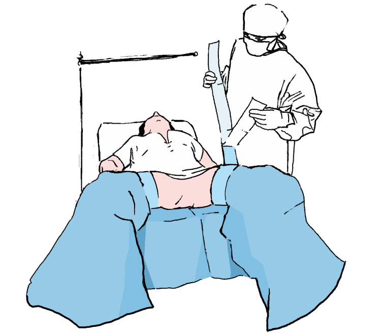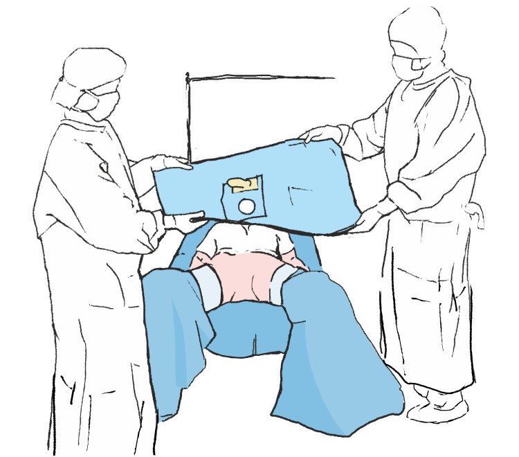 Частично раскладываем основную простыню на пациенте, подгоняя отверстия под соответствующие места операционного поля и кладем простыню на пациенте обозначая тем самым операционное поле.