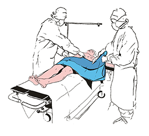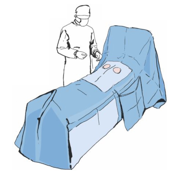 Крепим простыню к телу пациента, обозначая нижнюю границу операционого поля. Оставшейся частью простыни закрываем ноги.