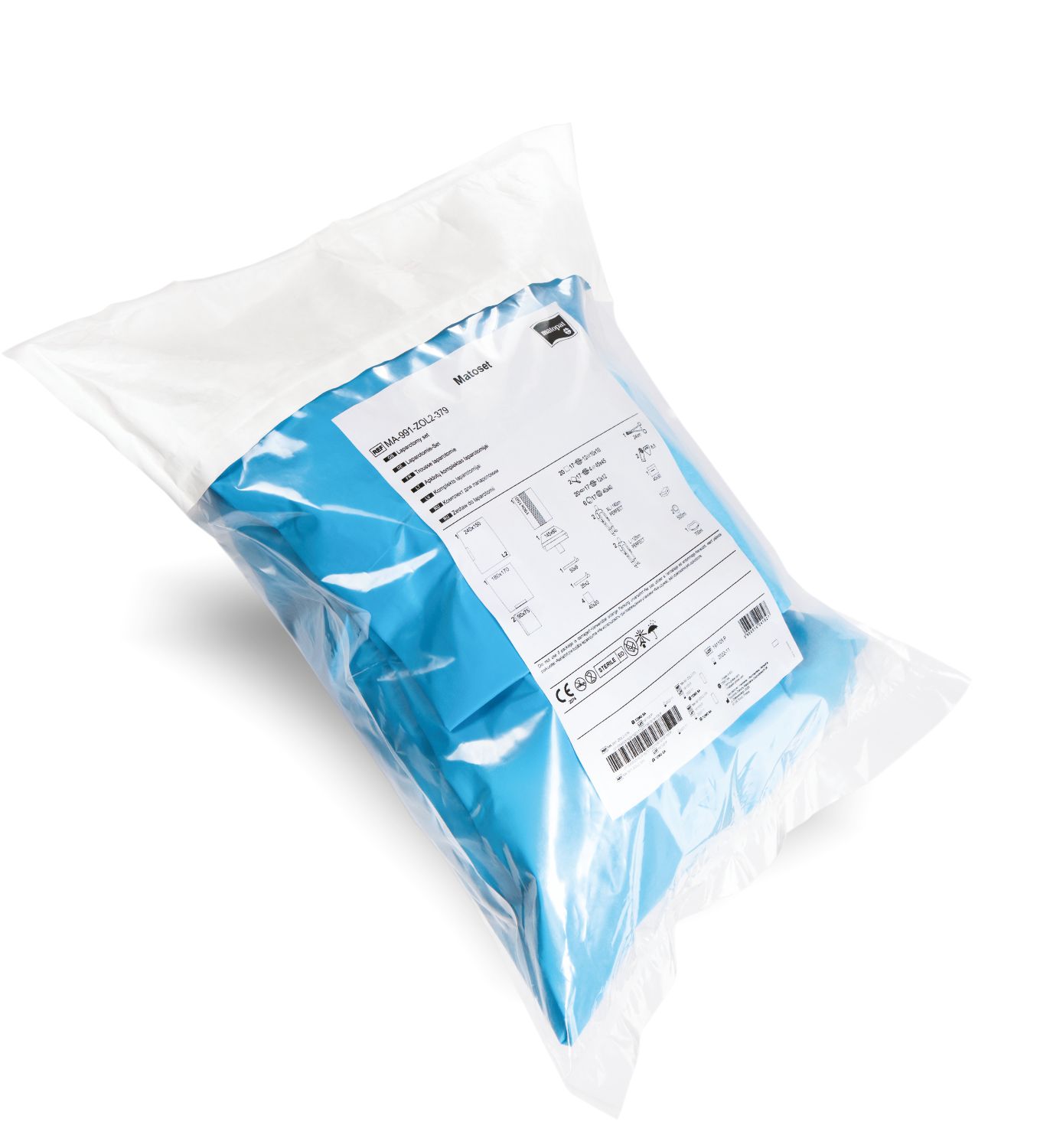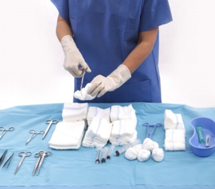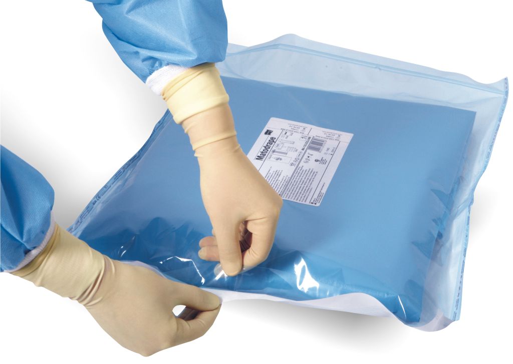 После вскрытия упаковки раскладываем комплект на инструментальном столе. Простыня на инструментальный стол, в которую завернут комплект выполняет функцию защиты инструментального стола, на ней следует разложить элементы комплекта. Обратите внимание на символы, всказывающие в каком направлении следует раскладывать простыни.